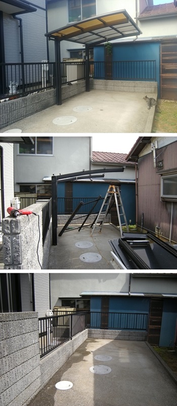 カーポート撤去、植木の伐採と抜根、プレハブの解体、